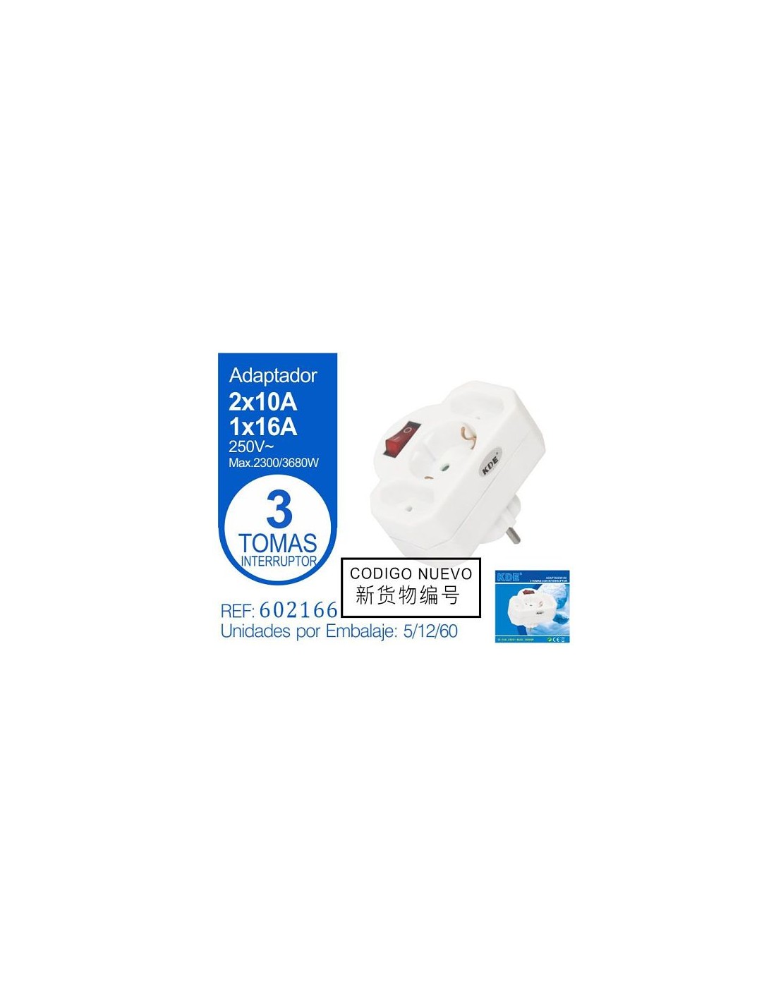 ADAPTADOR 2 VIAS 10A + 1 VIA 16A CON INTERRUPTOR
