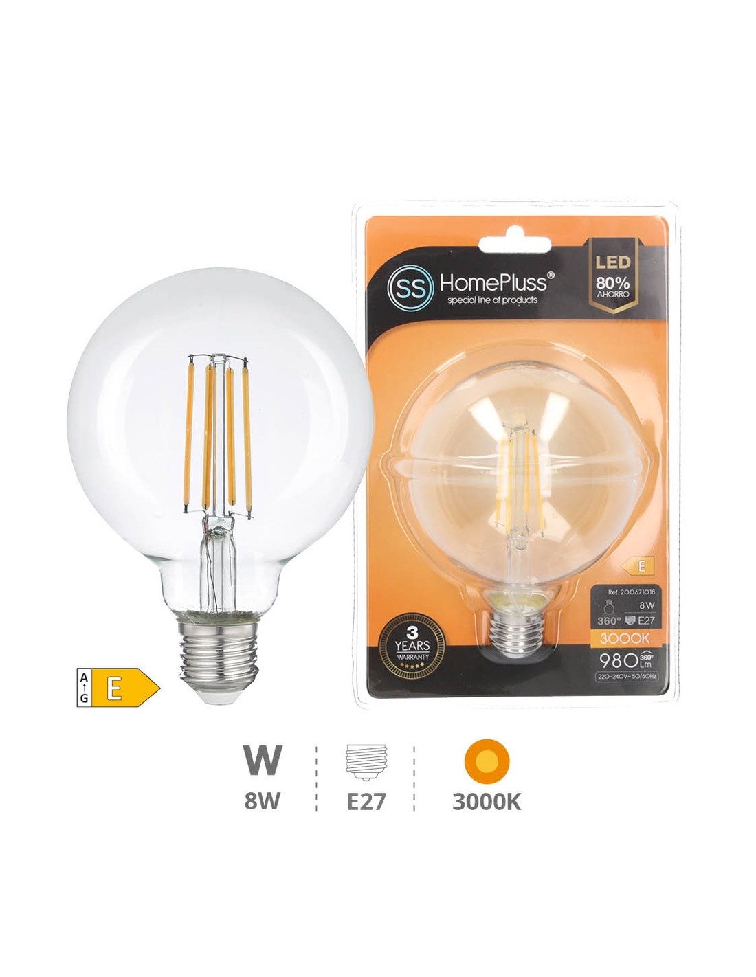 BOMBILLA 8W E27 3000K LED GLOBO FILAMENTO
