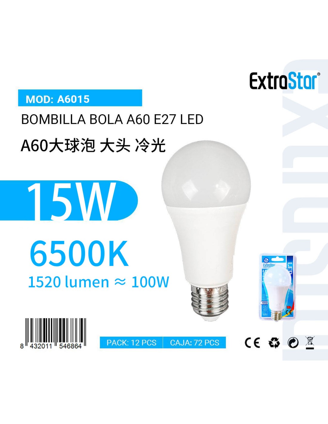 BOMBILLA A60 LED 15W 6500K 1520LM