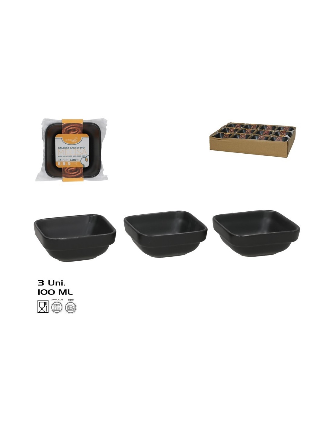 SALSERA APERITIVO X3 MELISA 100ML 8X8X3,2CM NEGRO